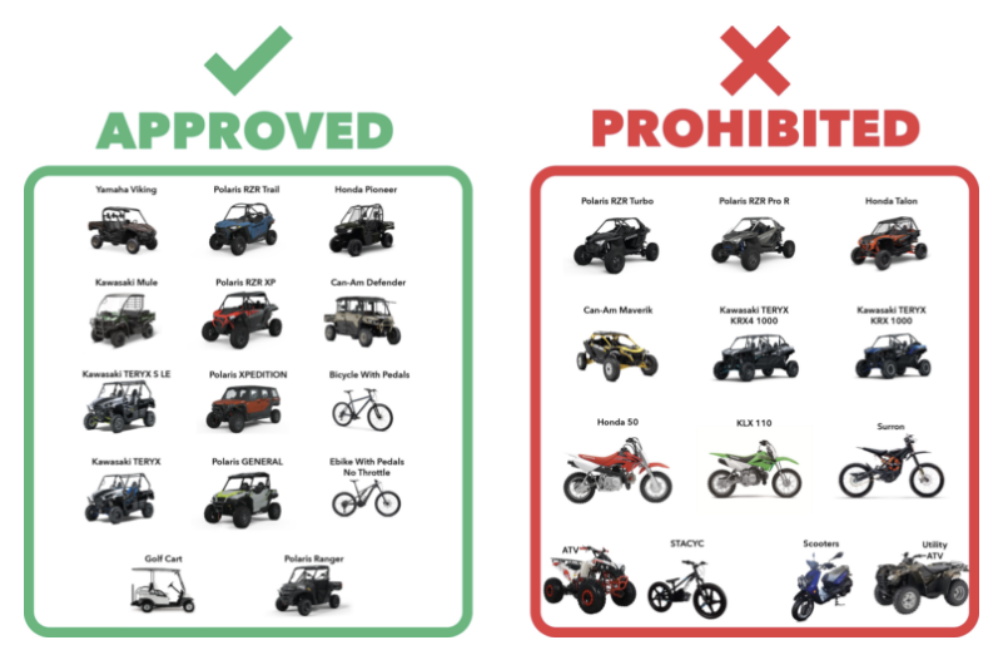• NO Motorcycles, Mini-cycles, ATV’s or electric bicycles with throttles